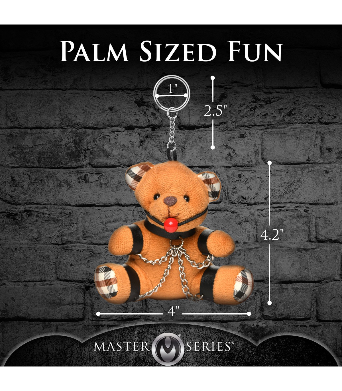 Dale a este osito bondage como un regalo de broma o guárdalo para ti. Este osito cabe en la palma de tu mano y se puede sujetar a un llavero o bolso para señalar de manera divertida tu lado pervertido. Con tobillos y muñecas esposados, cadenas que atan sus diminutos brazos y una mordaza de bola en su boquita peluda, este osito es una manera divertida de agregar un toque travieso a tu colección. Fabricado en materiales seguros para el cuerpo, incluyendo metal sin níquel.